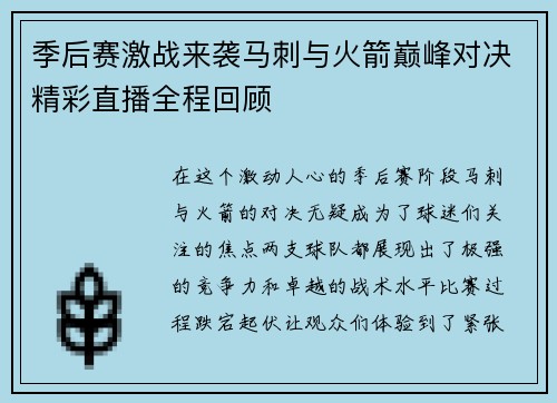季后赛激战来袭马刺与火箭巅峰对决精彩直播全程回顾